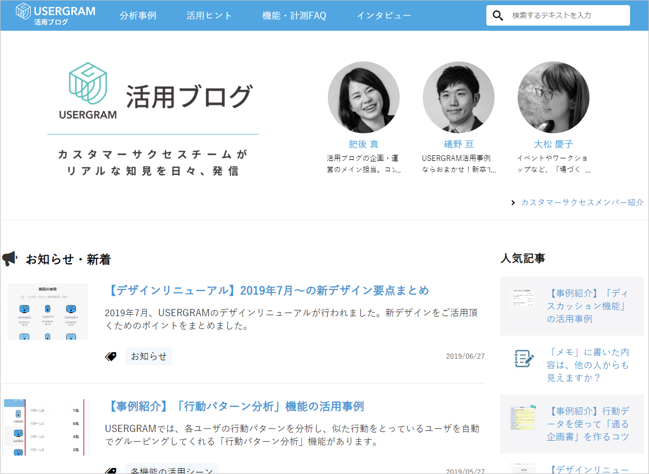 既存のヘルプサイト(https://help.usergram.info/)は機能や仕様に関する説明が中心でしたが、本ブログでは施策別の分析事例や業務内での行動データ活用例、成功企業様のインタビューなど、より活用に重点をおいた情報をご紹介することで、自らの疑問ベースでは気づけなかったUSERGRAMの利用方法など、新たな気づきをご提供し、今まで以上に効果的なご支援を実現する役目を担います。