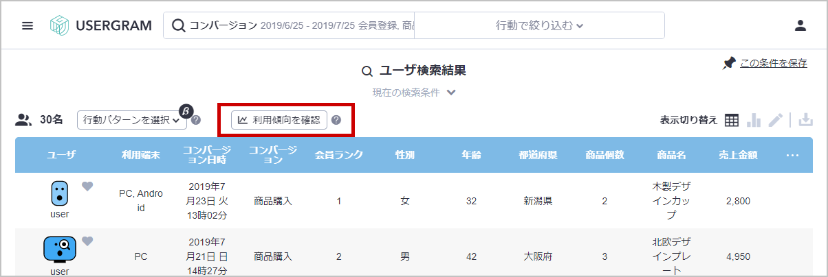 - ユーザ検索、行動の絞り込みを行った後のユーザ一覧画面上において、「利用傾向を確認」ボタン押下により、当該条件下のユーザセグメントにおける各種利用傾向を分析・表示