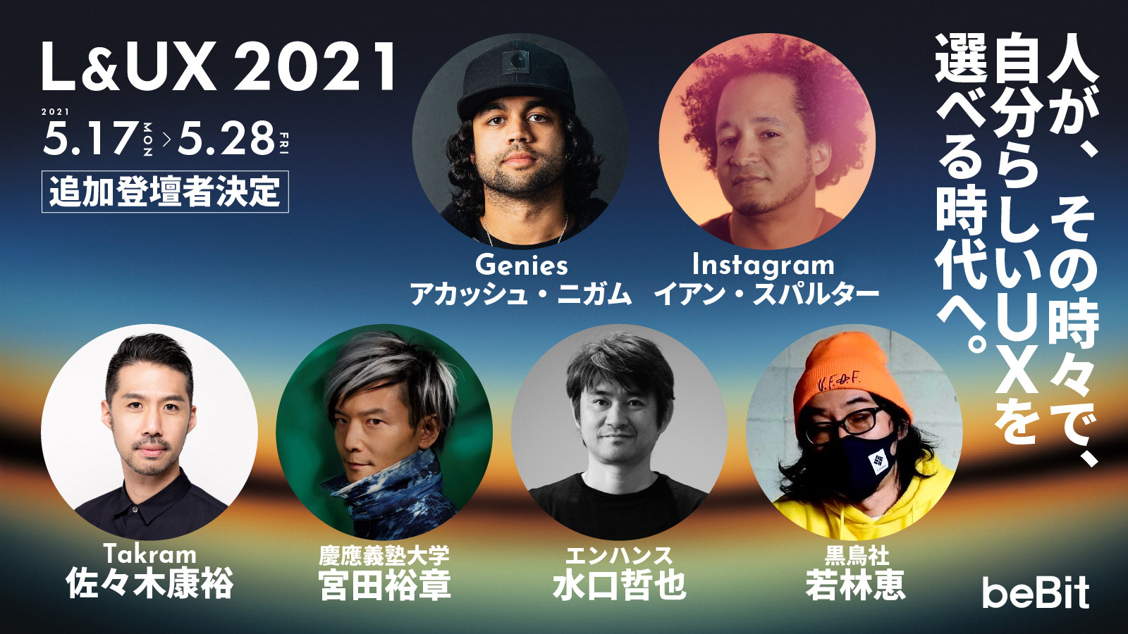 ビービットは「人が、その時々で、自分らしいUXを選べる時代へ。」というメッセージを、書籍『アフターデジタル』シリーズを通して発信し続けてきました。この度、このメッセージにご賛同いただいたグローバルリーダーの方々に集まっていただき、「L&UX2021」を開催いたします。