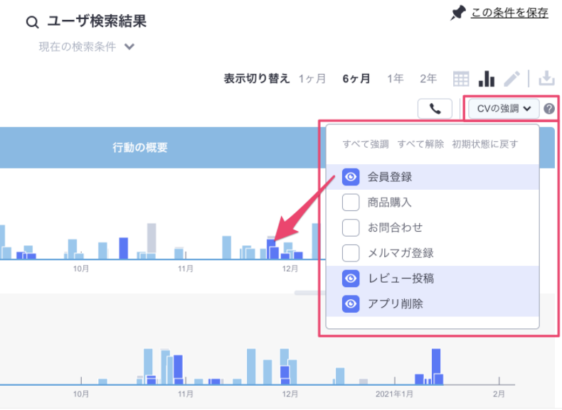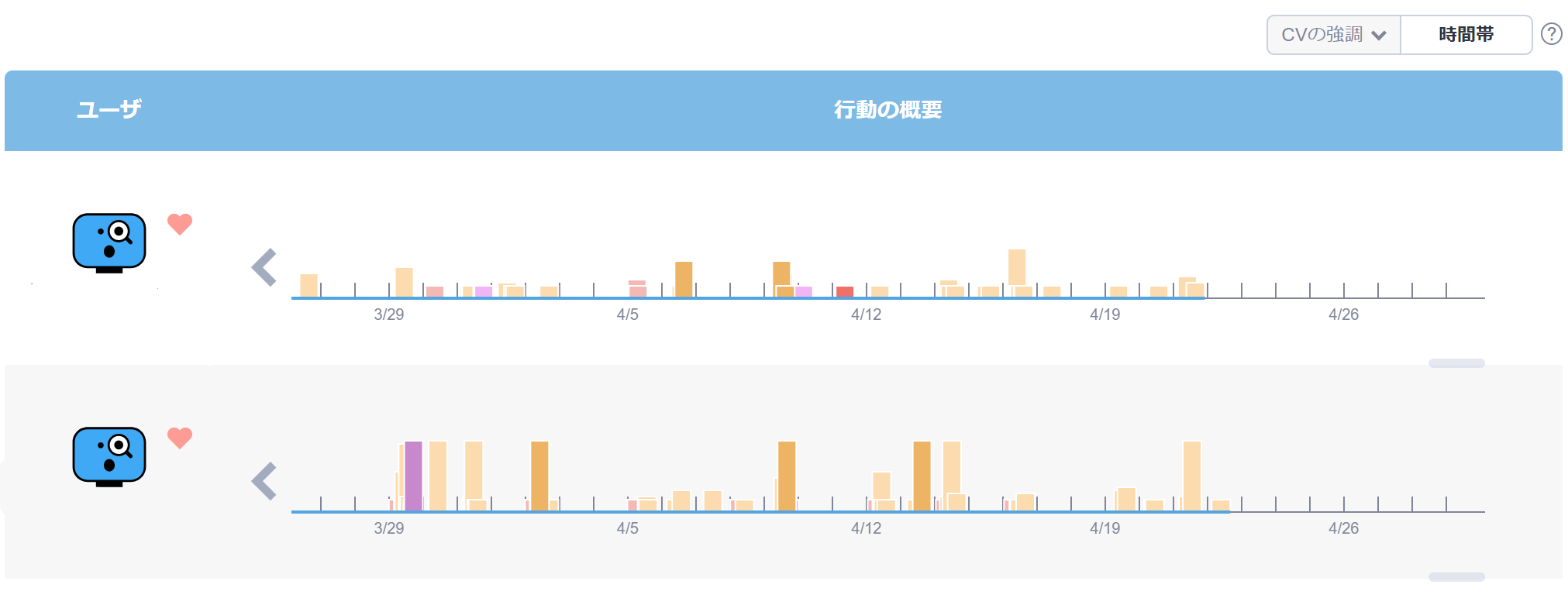 複数種類のCVをトラッキングしているアカウントでも、今回追加した「個別のCV強調」機能で個々のCVを確認できます。強調させたいCVを選択すると、そのCVがあったユーザの訪問バーのみが青色で表示されます。