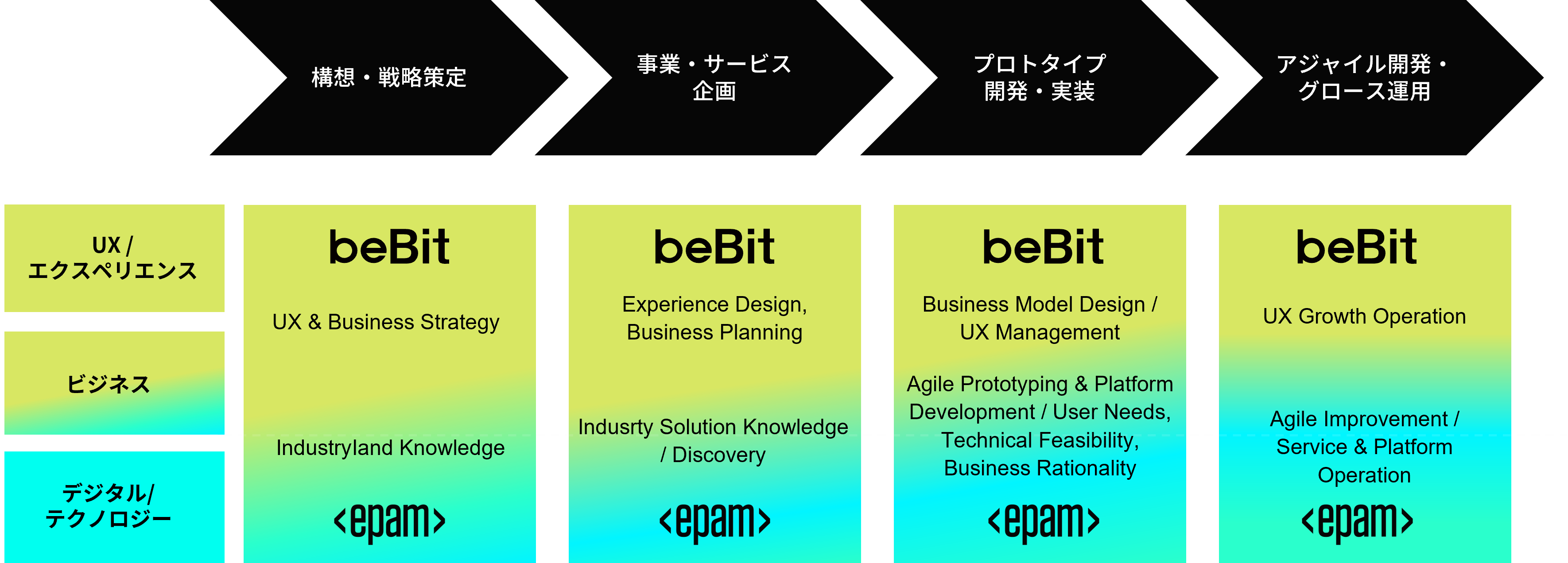 この度、ビービットが課題としていた「UXファーストを維持しながら、高品質なITシステムの設計・構築を行う」という機能を、EPAMとの共同提供によって補完し、UXファーストな企業支援をエンドツーエンドで提供することが可能になりました。