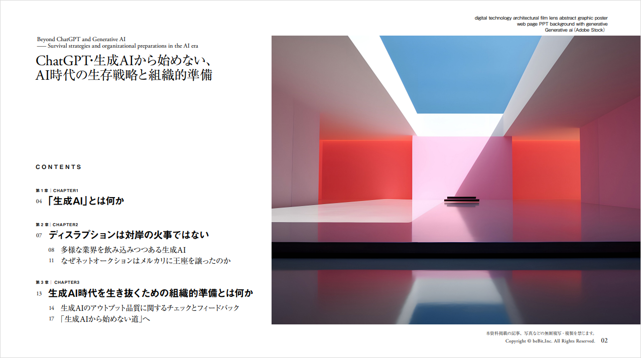 株式会社ビービット(本社:東京都千代田区、代表取締役:遠藤 直紀、以下「ビービット」)は、最新レポート「ChatGPT・生成AIから始めない、AI時代の生存戦略と組織的準備」(以下、本レポート)を公開しました。本レポートでは、顧客向けサービスへの生成AI活用の必要性を感じつつも、さまざまな理由から検討開始できずにいる事業組織の責任者・マネージャ層に向けて、生成AI導入前に実施すべき準備について解説しています。