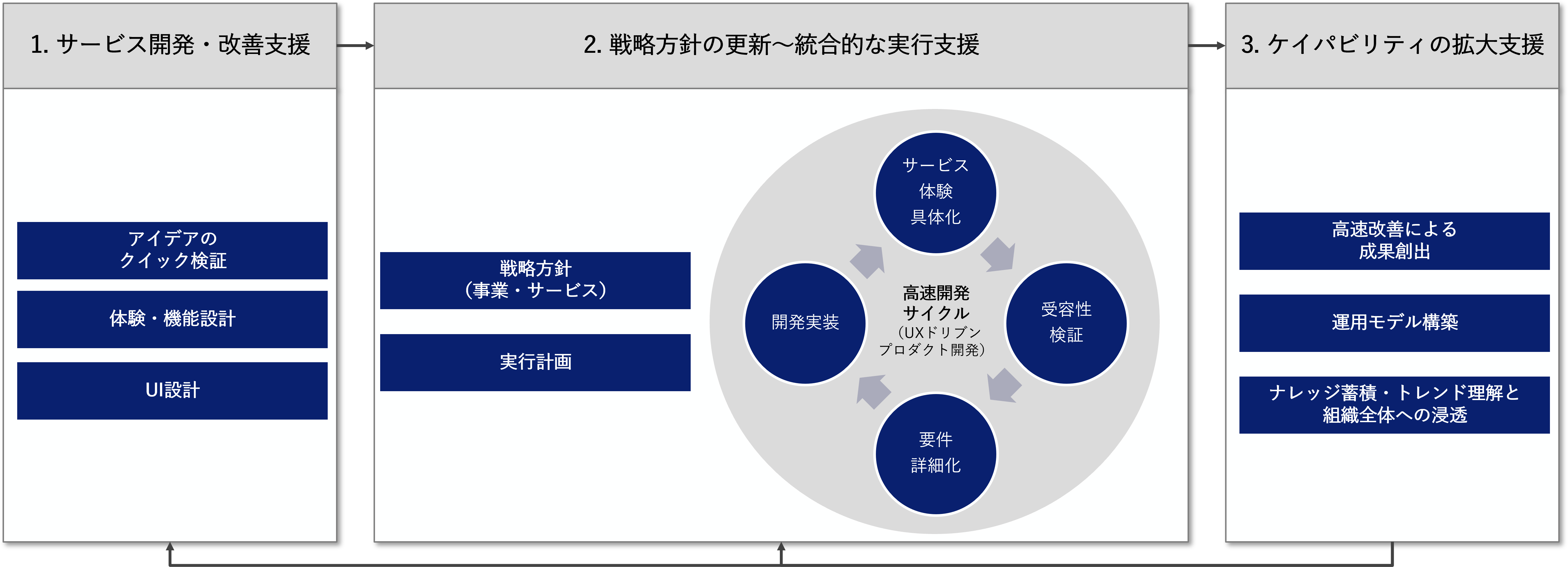 エクスペリエンス・ビジネス・テクノロジーの3つの観点を統合し、スピーディーな企画開発と検証を通じて、各社が目指す成果創出につながる実効性の高いサービス実現を支援します。