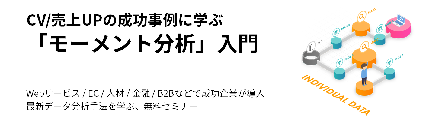 Webサービス / EC / 人材 / 金融 / B2Bなど幅広い業界で導入が進む、行動データ分析の最新手法『モーメント分析』について、分析の考え方から具体的な成功事例まで徹底解説する無料セミナーです。