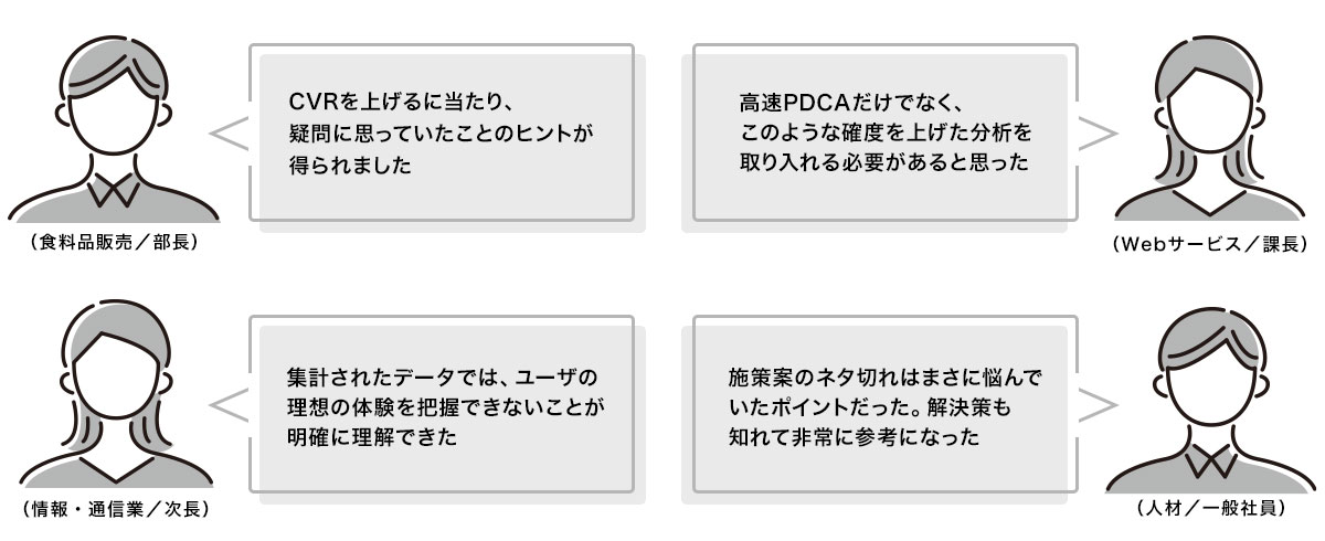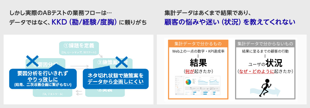 本セミナーでは、劇的にABテストの勝率を向上させた企業様の成功する鍵となった「UX企画につながる新しいデータ分析手法」(=ユーザの悩みや迷い(状況)を、もっと正しく、より簡単に捉えられるデータの見方)を、他社事例を交えてご紹介します。ポイントは「集計されたデータだけを見ないこと」です。