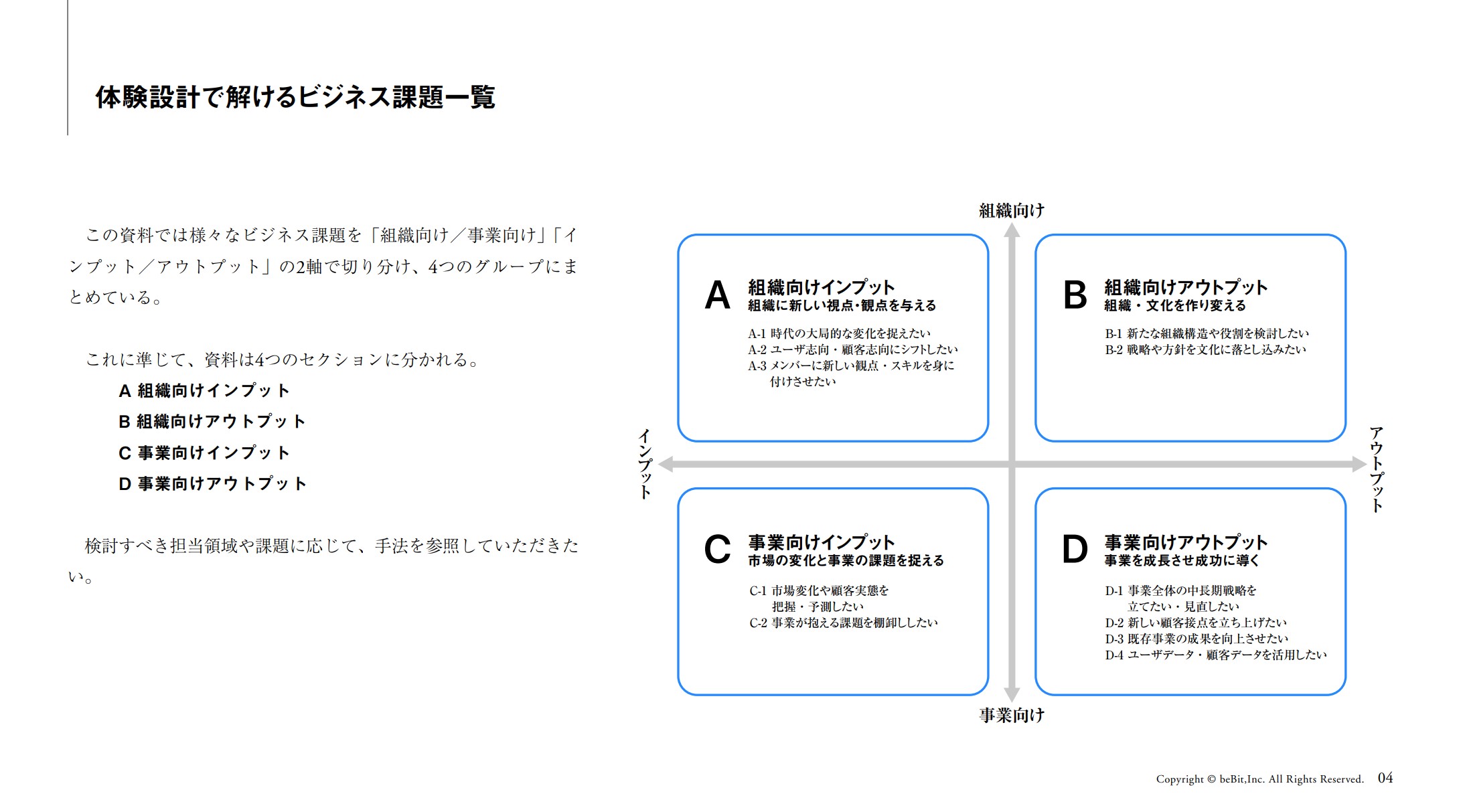 本レポートでは、企業が直面する様々なビジネス課題を4つのグループに整理し、それらをUX/CXアプローチによって解決する際の方法をご紹介します。