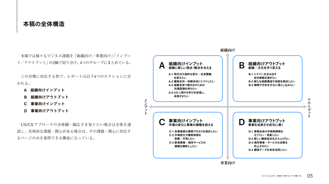 「UX/CX index」は、企業を苦しめるビジネス課題を、体験起点・顧客起点でどのように解決できるのか通覧できるレポートシリーズです。