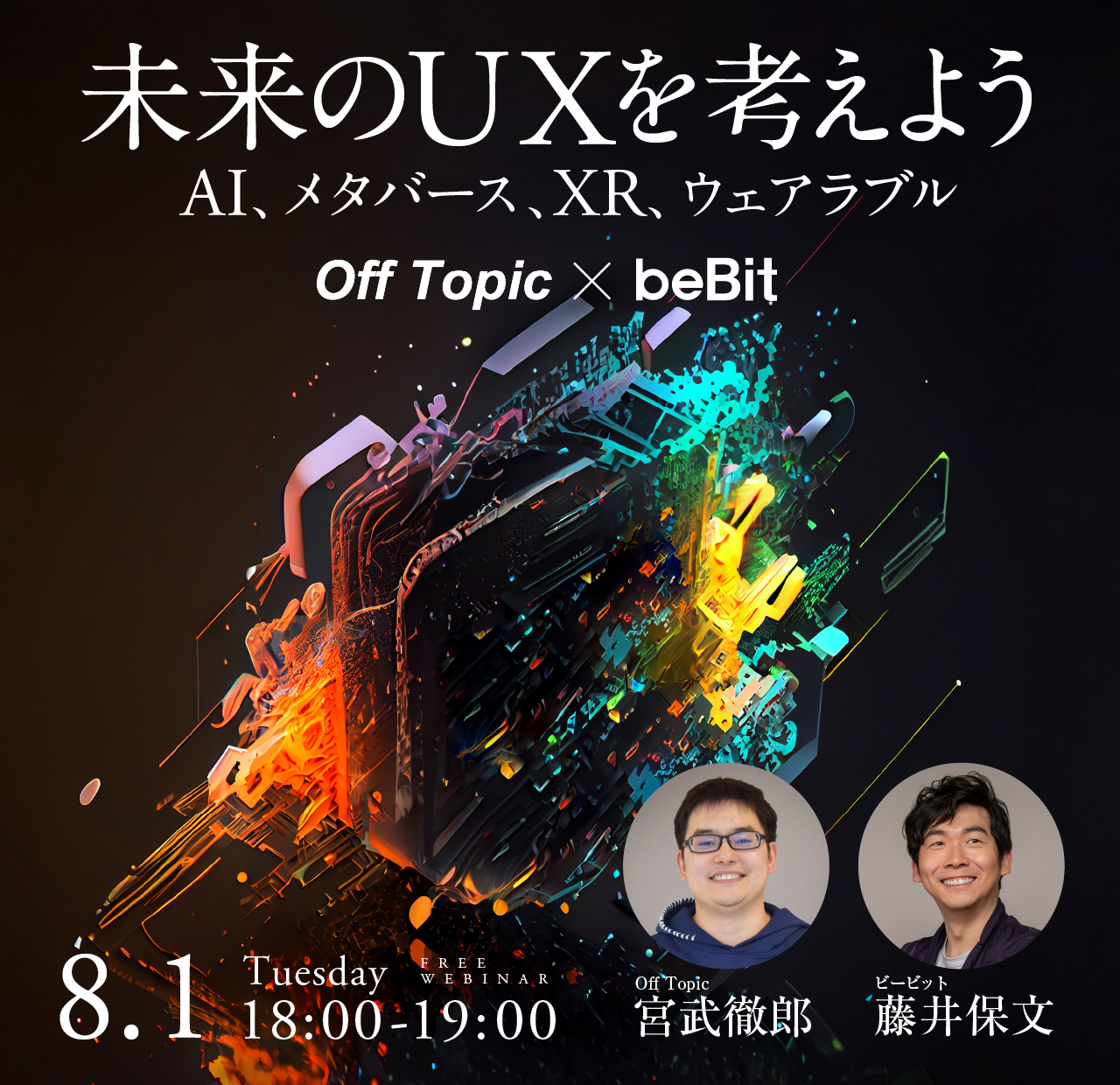 ビービット藤井もずっと聴き続けている人気ポッドキャスト"Off Topic"を運営し、いつも未来を届けてくれる宮武さんに、藤井保文がAI、メタバース、XR、ウェアラブルなど、起こり得る未来をぶつけて議論します。