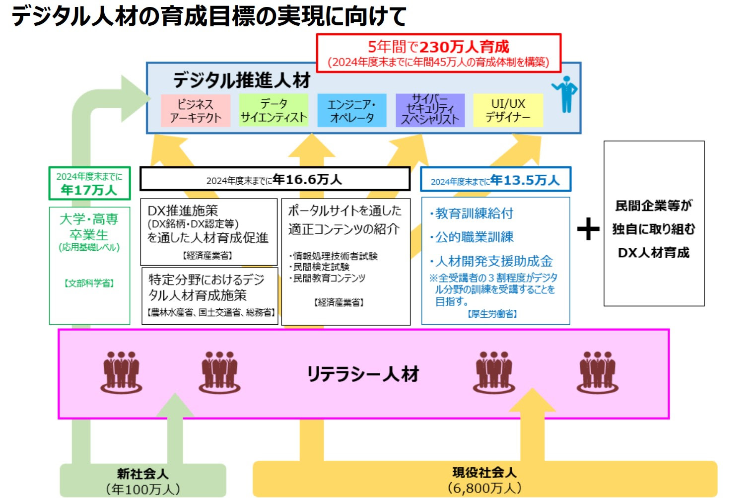 ここでのUI/UXデザイナーの定義は「顧客との接点に必要な機能とデザインを検討し、システムのユーザー向け設計を担う人材」とされていて、ビジネスアーキテクトやデータサイエンティストなどをあわせた5職種の人材を、5年間で230万人育成する計画だそうです。