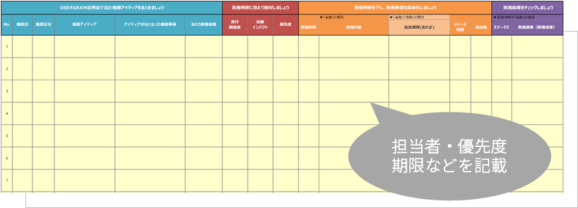❝現在は2週間に1回のチームミーティングの場でUSERGRAMを見てディスカッションを行い、その場で次の改善企画を立てて実行担当まで決める、というサイクルが軌道に乗り始めたところです。実際には実装フェーズや検証フェーズもあるので毎回新しい企画が立ち上がるわけではありませんが、確実に1つずつ進めてきています。検証の中で次の改善企画が見えてくることも多いですよ。❞