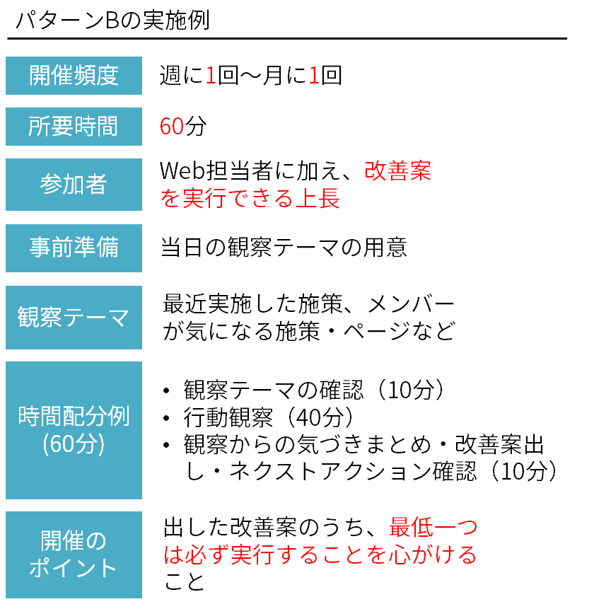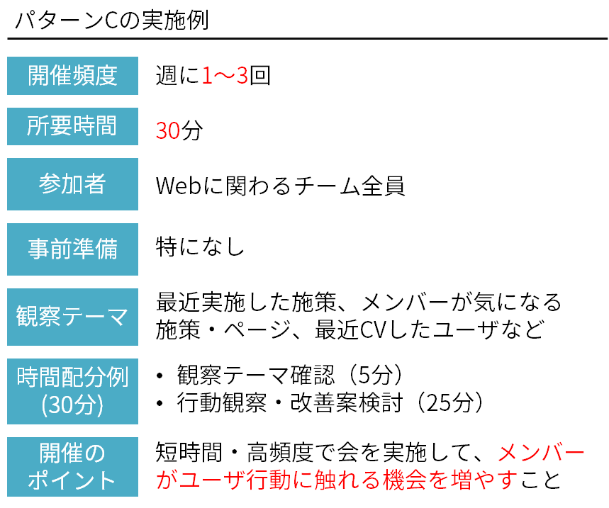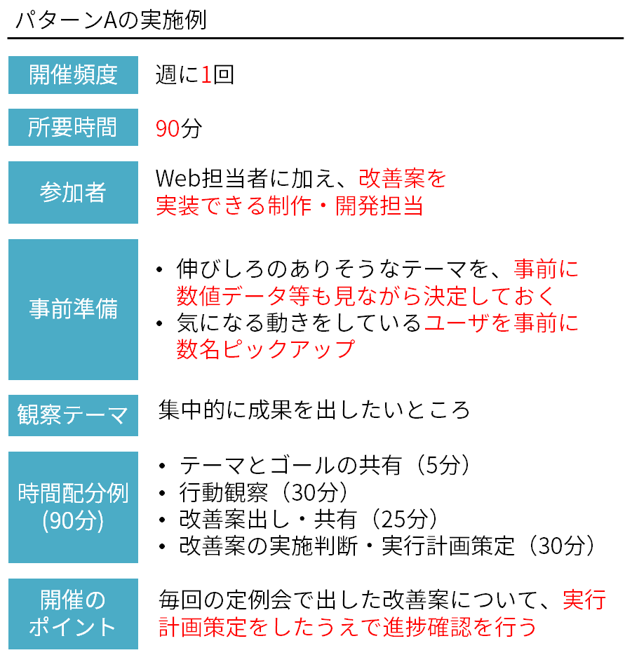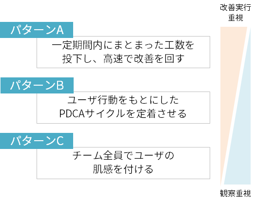 パターンAのように短期集中型ではなく、無理のないペースで改善を回していき、ユーザ行動をもとにした改善案出しが業務に浸透することを目的にするパターンです。
