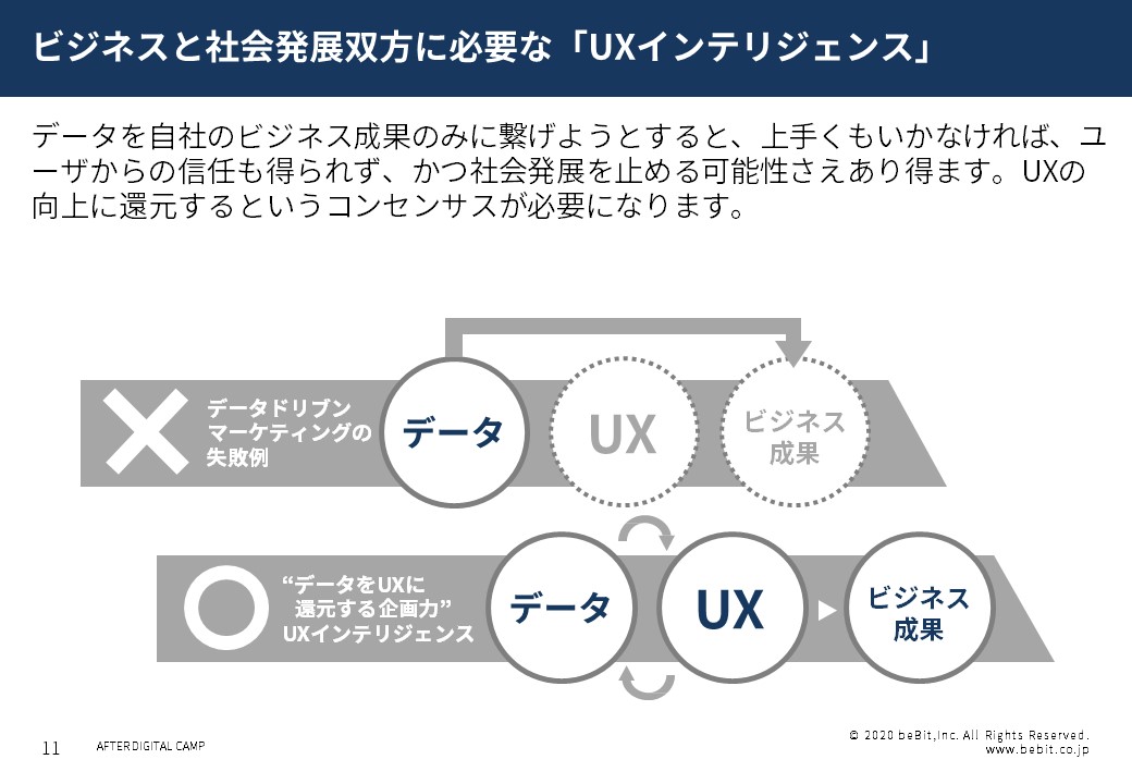 アフターデジタルの世界では、よりよいUXを生み出すことが、競争力の源泉になっていきます。良い体験には人が集まり、データが蓄積されていきます。そして、そのデータを利用すれば、さらにUXを改善できます。