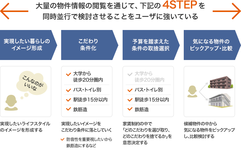 これまでの物件情報サービスは、実現したい暮らしのイメージ、こだわりの条件化、予算を踏まえた条件の取捨選択という「希望と計画」がある前提で「物件情報の中から基準を満たすものを見つける」という最後のステップに特化してサポートしています。そのため、希望と計画が明確になっていないお部屋探し初心者が既存サービスを使うと、知識がない中で全ての検討を同時並行で進めるという複雑なことをしなければならず、選びきれないという結果につながっているのです。