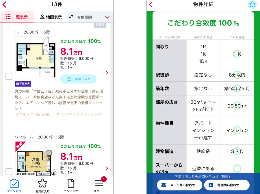 物件を表示する画面では、その物件が入力した条件にどの程度合致しているのかを示す「こだわり合致度」が表示されます。この数字を手がかりにすることで、大量の物件情報を見続けるのではなく、希望に合った物件の情報だけを見ることができるようになり、お部屋探しのプロセスが格段に効率的になります。