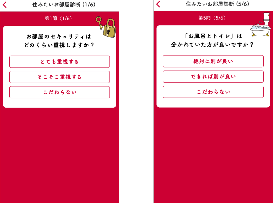 用意されている質問項目は、お部屋探し初心者にも比較的答えやすいものばかり。質問に回答していくと、それに対応してオートロック有無などの条件が設定されていきます。