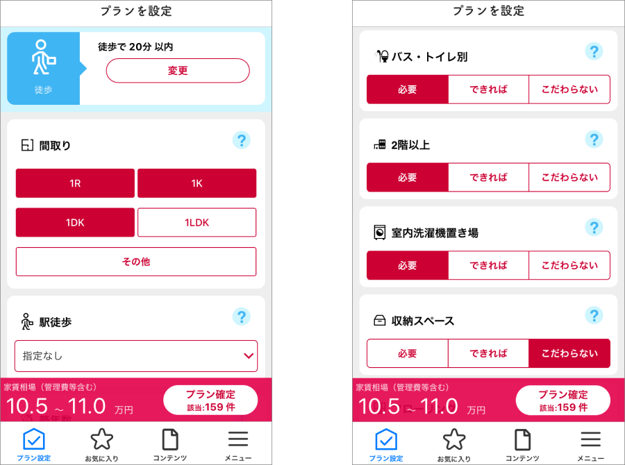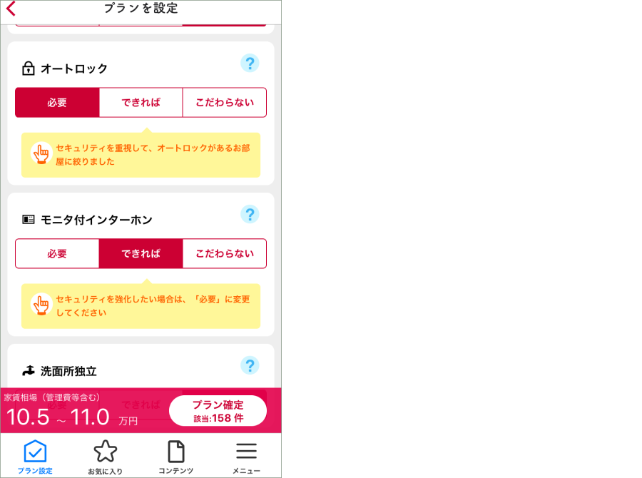 計画を立てるフェーズでは、間取りや駅徒歩分数など、こだわり条件を1つずつ設定していきます。お部屋探し初心者がつまずきそうなところには「?」マークがついていて、解説が読めるようになっています。