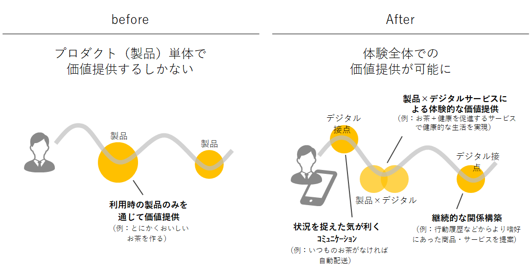 ビフォアデジタルの時代、プロダクトはおいしさや機能性など、それ単体で単発の価値を提供してきました。ですがデジタルとデータの活用により、ユーザを単発ではなくプロダクト体験の前後も捉えて、体験的な価値を提供することが可能になっています。それこそ、ヘルシア事業で目指すことであり、また花王様が企業として目指す「顧客との継続的な関係構築」につながるとビービットでは考えました。