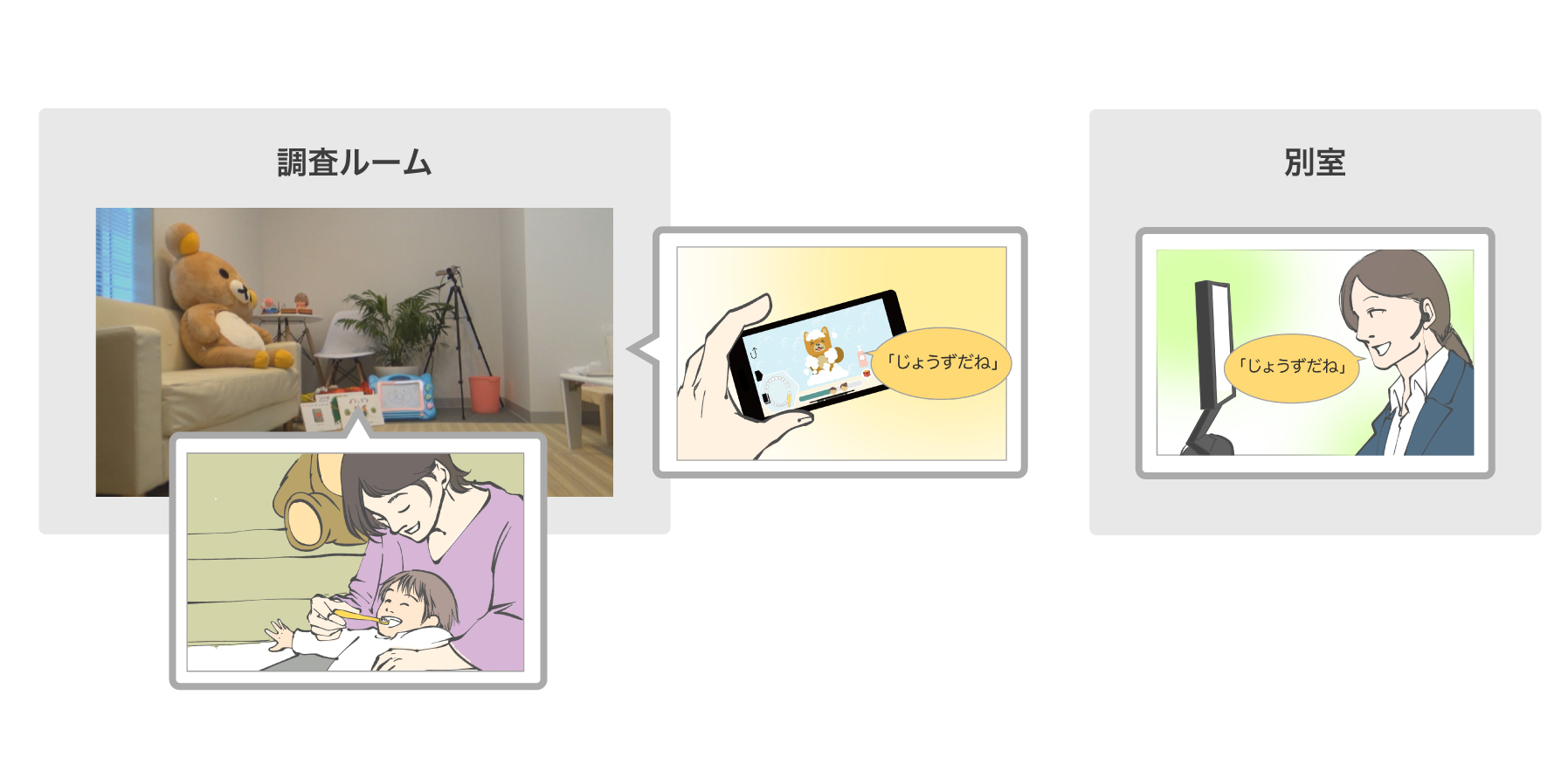 初回のモニター調査は、ビービット社内の特別な部屋にて実施。案件ごとにカスタマイズしていますが、今回はモニター親子にスマホを見ながら歯みがきをしてもらい、別室から話しかけるという、アナログな工夫を凝らした調査を実施しました。
